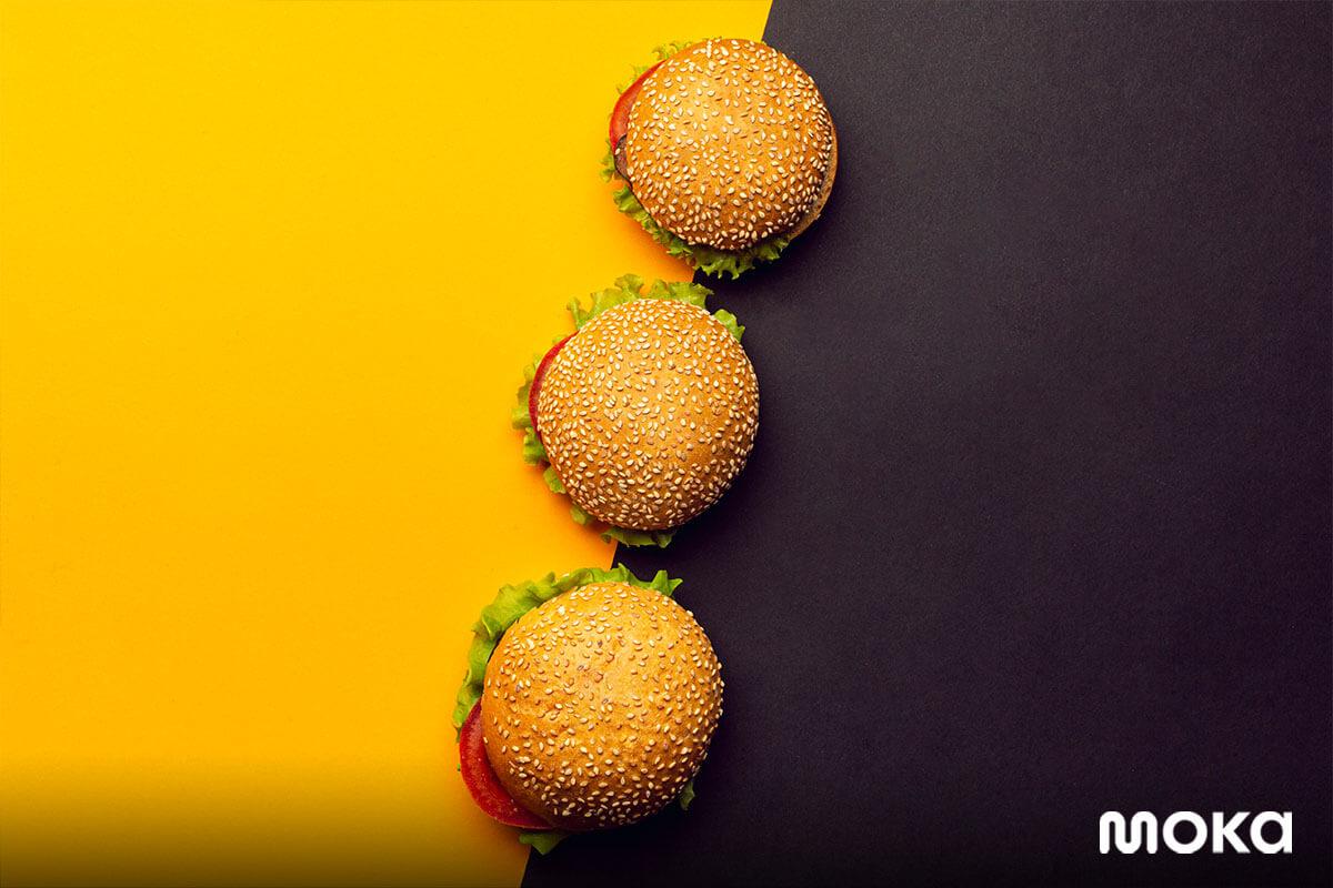 Foto ini tampak lebih menarik lantaran menggunakan background dengan warna yang kontras, yakni kuning dan hitam, yang mana membuat 3 burget di garis tengah tampak lebih menonjol. Foto makanan ini cocok untuk dipublikasikan di media sosial atau mungkin dijadikan wallpaper restoran Anda.